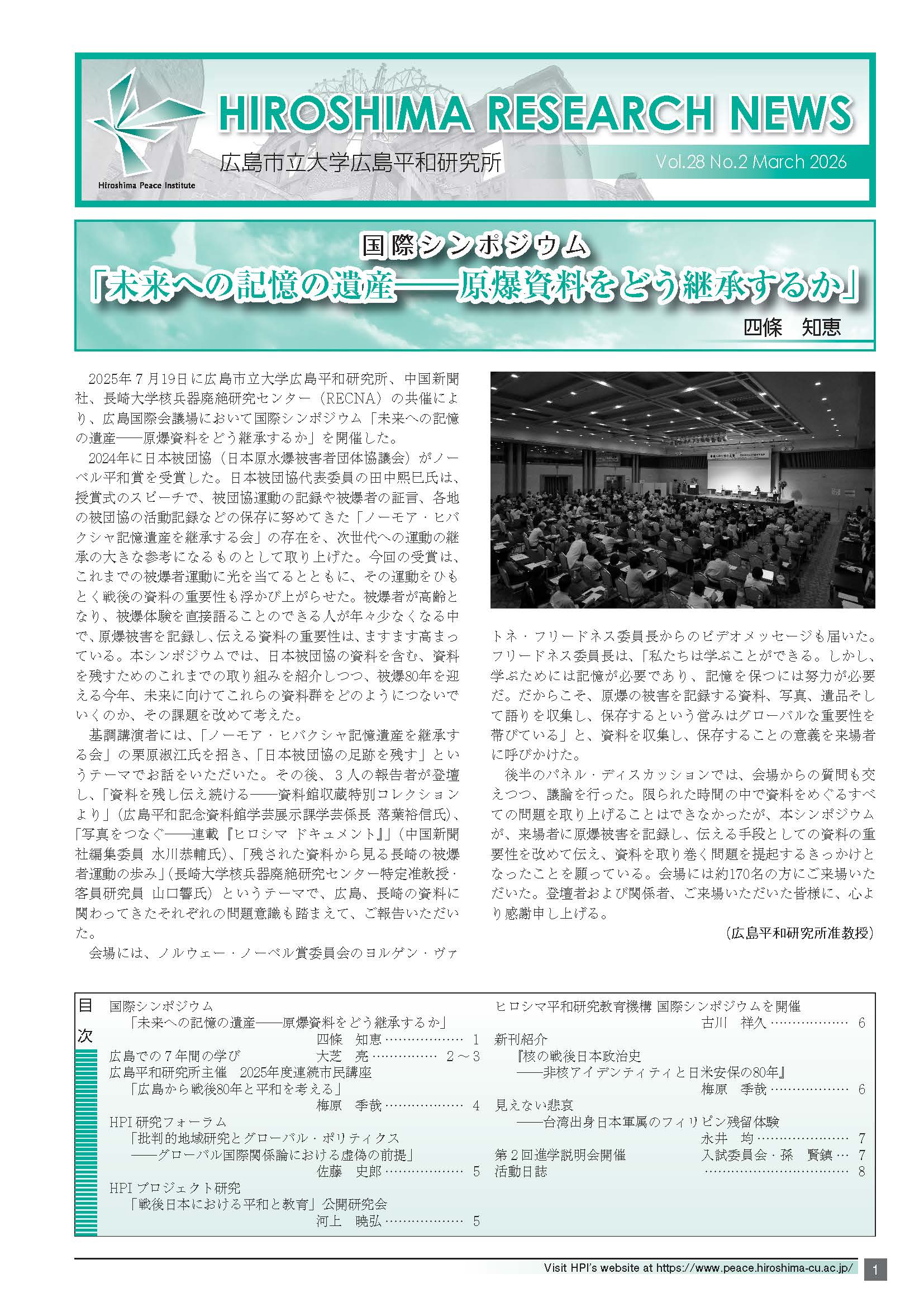 The HPI newsletter HIROSHIMA RESEARCH NEWS has been published twice a year in both English and Japanese since the establishment of the HPI in 1998. It is composed of eight pages with reports on the HPI’s academic events, articles by our researchers, and peace-related commentaries by outside experts. The diary on the last page lists recent activities of our researchers.